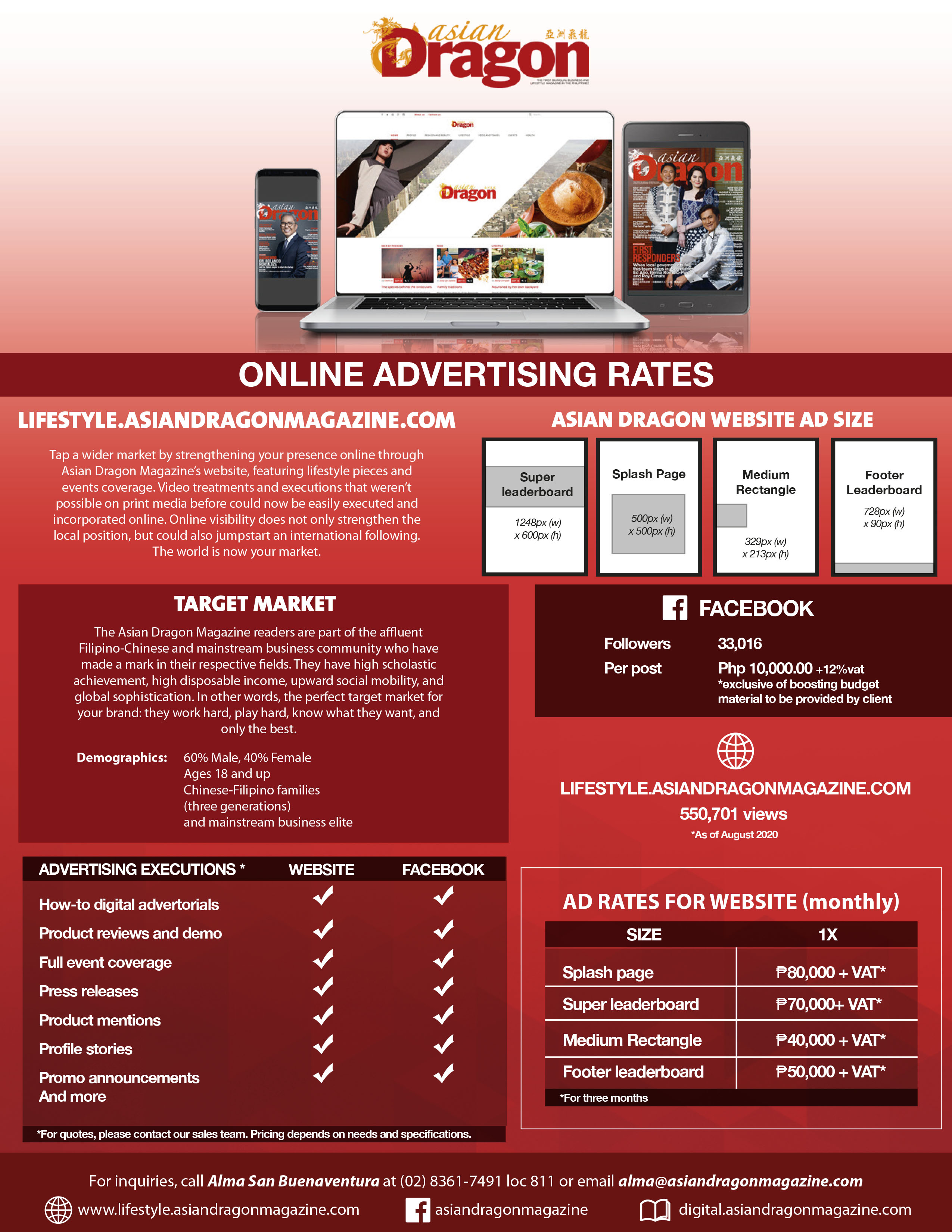 Tap a wider market by strengthening your presence online through Asian Dragon Magazine’s website, featuring lifestyle pieces and events coverage. Video treatments and executions that weren’t possible on print media before could now be easily executed and incorporated online. Online visibility does not only strengthen the local position, but could also jumpstart an international following. The world is now your market.