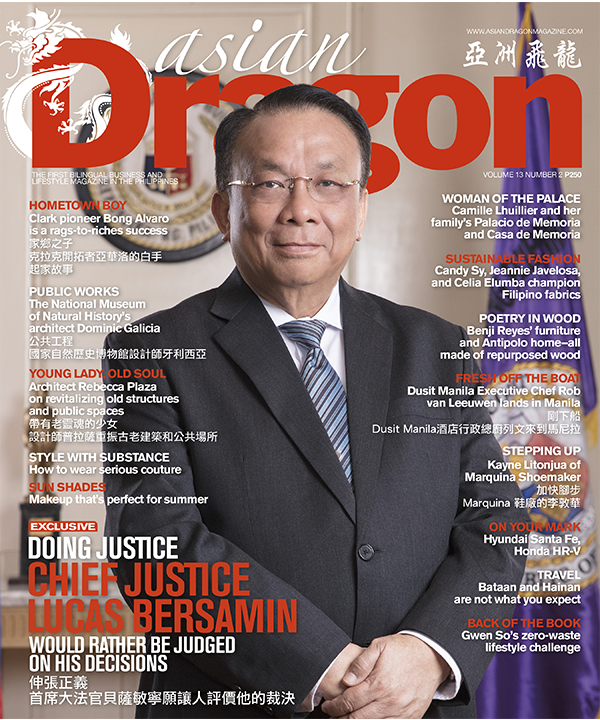 Asian Dragon thought it would be interesting to meet him and get to know him in the context of his career, which has been distinguished. Politics aside, this is a man who has risen through the ranks of the justice system, starting as a provincial lawyer. It is hard to argue that he lacks the qualifications and experience to be in the highest seat of the judiciary. The magazine tells his journey along with the inspiring stories of Clark pioneer Bong Alvaro, the National Museum of Natural History’s architect Dominic Galicia, Architect Rebecca Plaza, Palacio de Memoria’s Camille Lhuillier, Kayne Litonjua of Marquina Shoemaker, and many more.